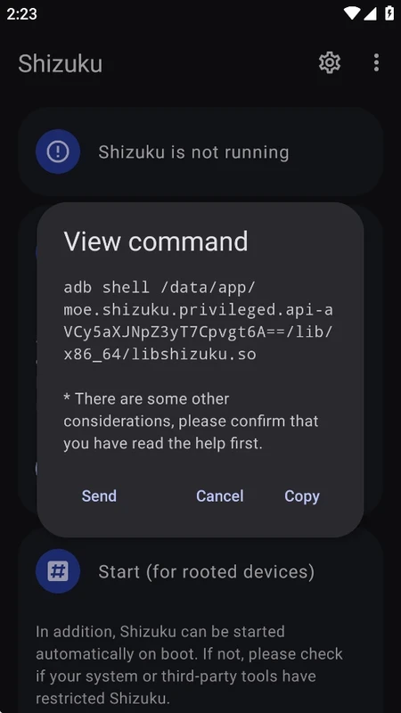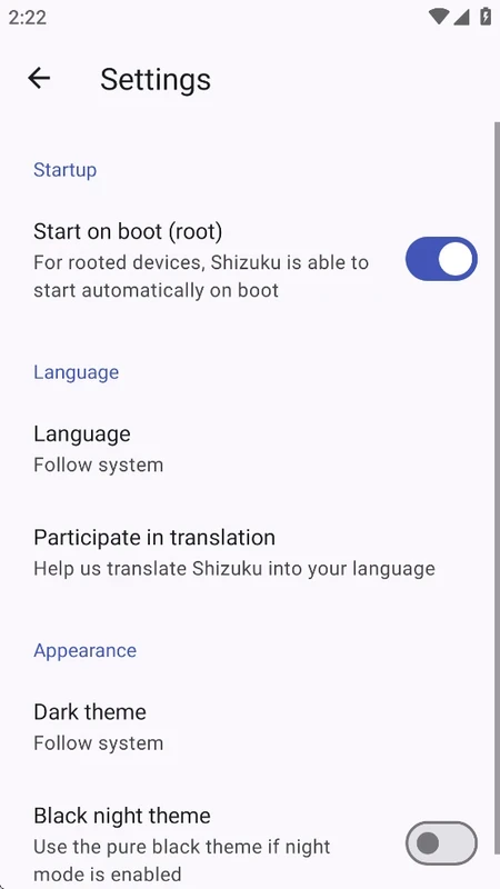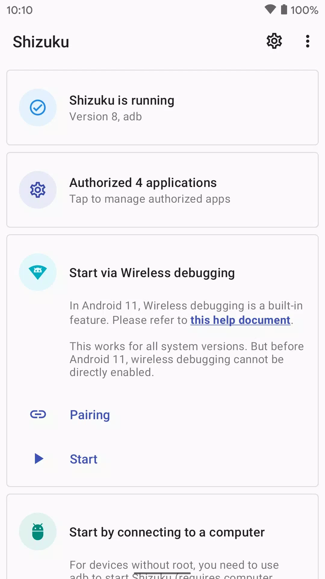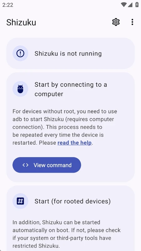 يدعم التطبيق طريقتين لتشغيل خادم Shizuku: ADB للإعداد بدون صلاحيات الجذر، أو باستخدام صلاحيات الجذر إن توفرت. إعادة تشغيل جهازك تتيح بدء تشغيل سريع في وضع ADB. بينما يُمكن إعادة التشغيل بسهولة باستخدام وضع الجذر، ويمكنك اختيار الطريقة التي تناسب احتياجاتك.